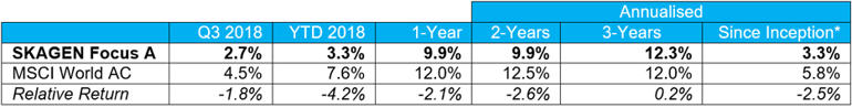 Solid absolute gains driven by strong Japanese performance as several new holdings join the fund. SKAGEN Focus A added 2.7% over the quarter, lagging the MSCI All Country World Index which climbed 4.5%.